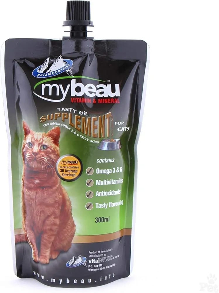 Support your cat’s overall wellness with MyBeau Vitamin & Mineral Supplement – a delicious oil-based formula enriched with essential Omega 3 & 6 fatty acids, multivitamins, and powerful antioxidants. This 300ml pouch delivers approximately 30 servings and is perfect for enhancing your cat’s diet with vital nutrients that promote a healthy coat, boosted immunity, and overall vitality. Its tasty flavor ensures easy consumption, even for picky eaters. Manufactured in New Zealand by VitaPower, MyBeau is trusted by pet owners for superior feline health support.