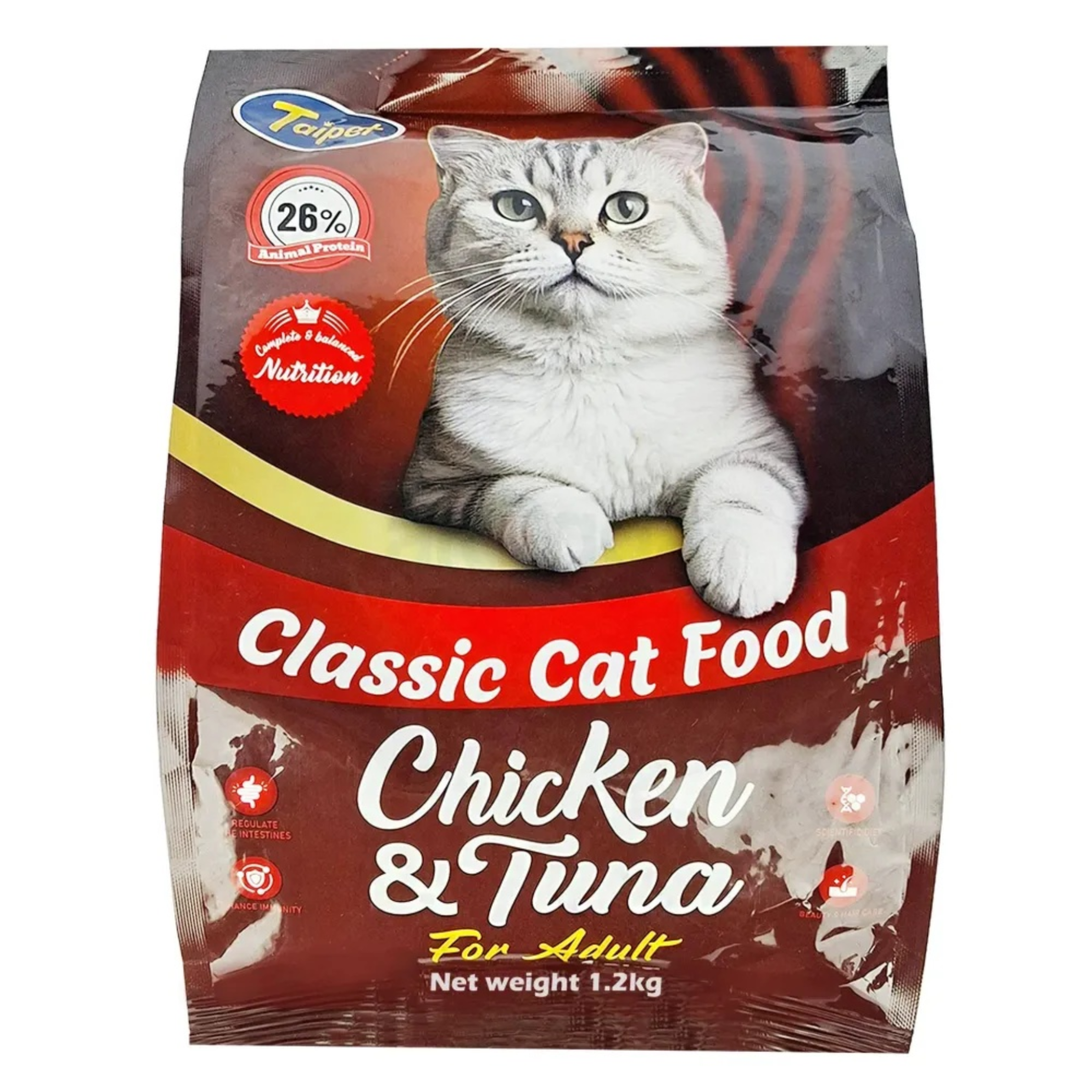 পূর্ণবয়স্ক বিড়ালের সুস্বাস্থ্য এবং প্রতিদিনের শক্তির যোগান দিতে Taipet Classic Cat Food Chicken & Tuna একটি আদর্শ খাবার। ১.২ কেজির এই প্যাকটি ১ বছরের বেশি বয়সী বিড়ালদের জন্য বিশেষভাবে তৈরি। এতে থাকা মুরগির মাংস এবং টুনা মাছের চমৎকার সংমিশ্রণ বিড়ালের খাবারের রুচি বাড়ায় এবং প্রয়োজনীয় প্রোটিন নিশ্চিত করে। এটি বিড়ালের হৃদপিণ্ড সুস্থ রাখতে এবং দৃষ্টিশক্তি উন্নত করতে সাহায্য করে।